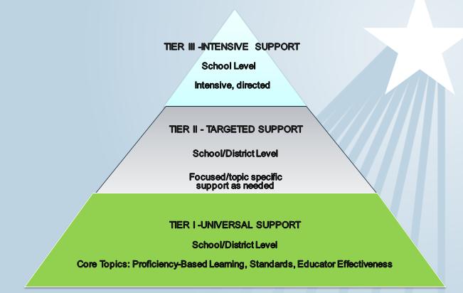 Prioritized by need. Our DOE is one of the nation’s smallest, which means that no matter how much more effective and efficient we become, we can’t meet all the needs that exist. We therefore have to prioritize, and our top priority has to be those schools and districts with the greatest need for our support. To achieve this, we’ve created an internal tiered system of supports (see left). The new School Performance Grading System and our ESEA waiver categories helped us to identify the schools that need to be our top priorities.- Designed to build networks of support. That the Department is focused on high-need schools does not mean the rest of Maine’s schools will go without support. One of the Department’s other goals with this new approach is to build networks of schools in order to maximize the reach of the training and support that is provided. With State and local resources limited, we see the building of these networks – both formal and informal – as a promising approach to maximize support resources. We will also continue developing our online Center for Best Practice, expanding it beyond its existing learner-centered focus to provide a platform for Maine schools to share their success stories with each other.