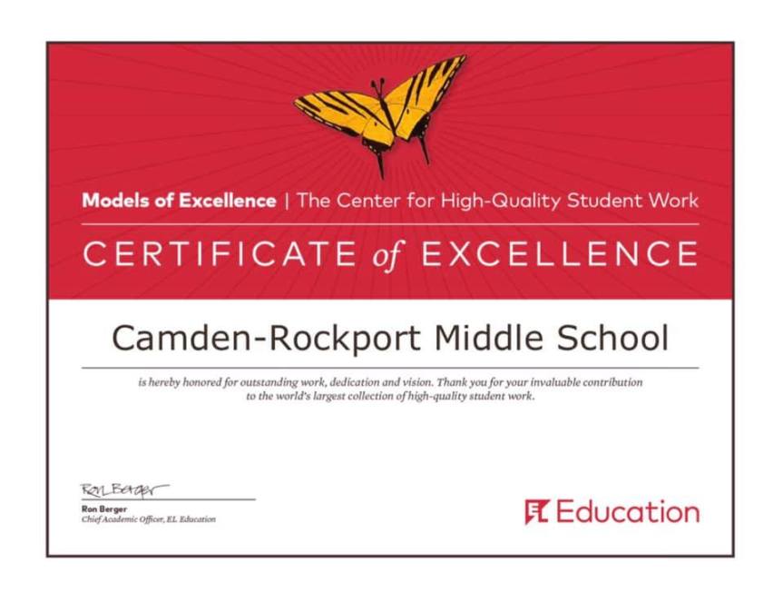 The release also said, “Camden-Rockport Middle School is so proud to have their hard work recognized. The school is on a journey to implement meaningful project based learning experiences for students and this is strong affirmation at the national level!”