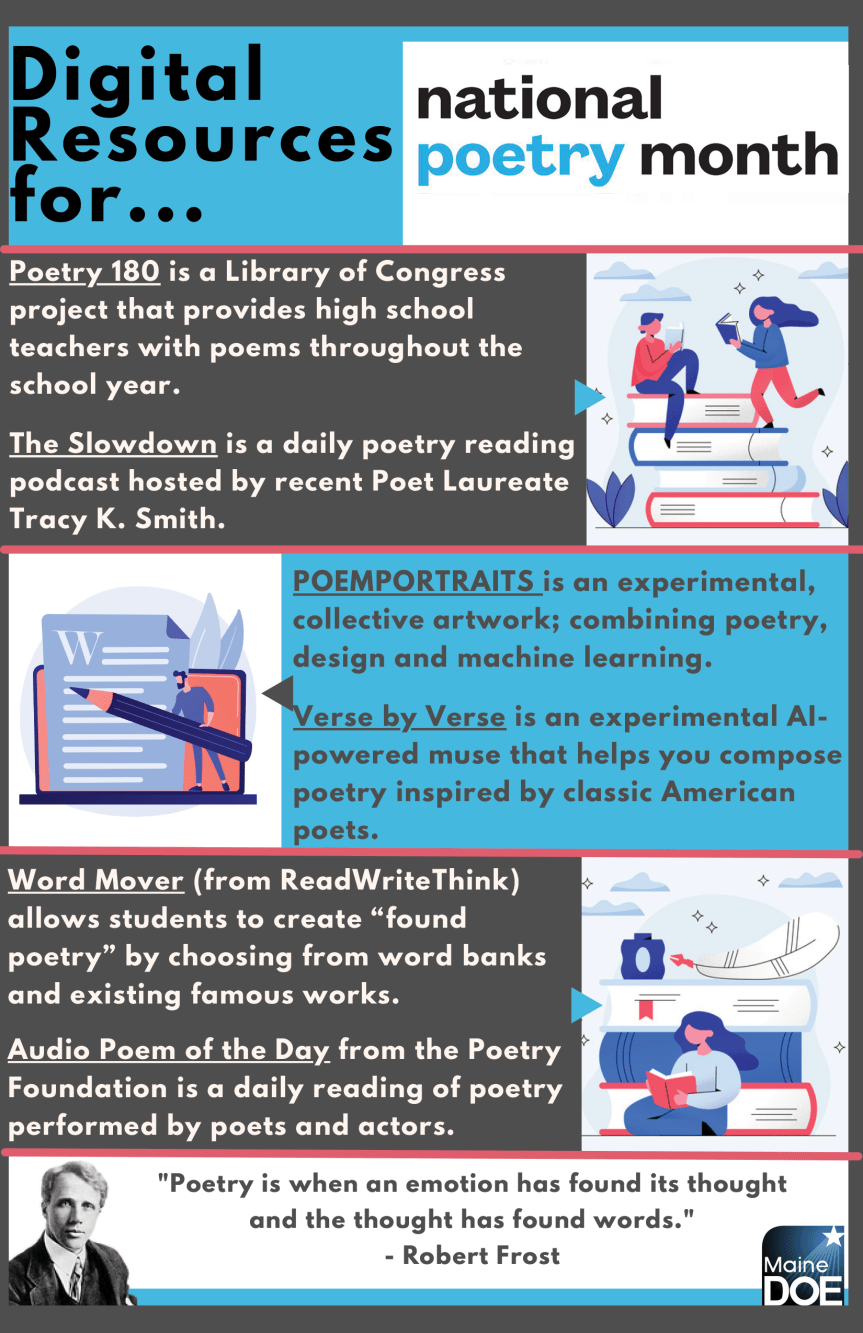The Maine Department of Education will be highlighting great poets with Maine ties all month long on our social media sites, follow us to learn more and continue the celebration: