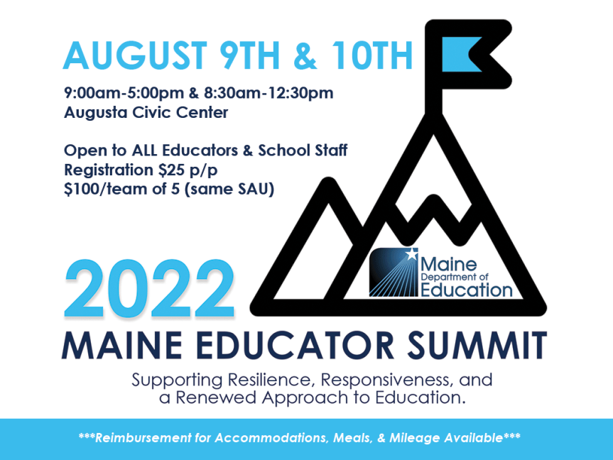 We hope that you and your colleagues will join us for the 2022 Maine Educator Summit at the Augusta Civic Center on August 9-10, 2022. The summit will offer a variety of sessions around topics like social-emotional learning (SEL), school safety, interdisciplinary learning, special education, and more. Participants will be able to join several different learning sessions over the two-day event and the Maine DOE is encouraging teams from each School Administrative Unit (SAU) to register.