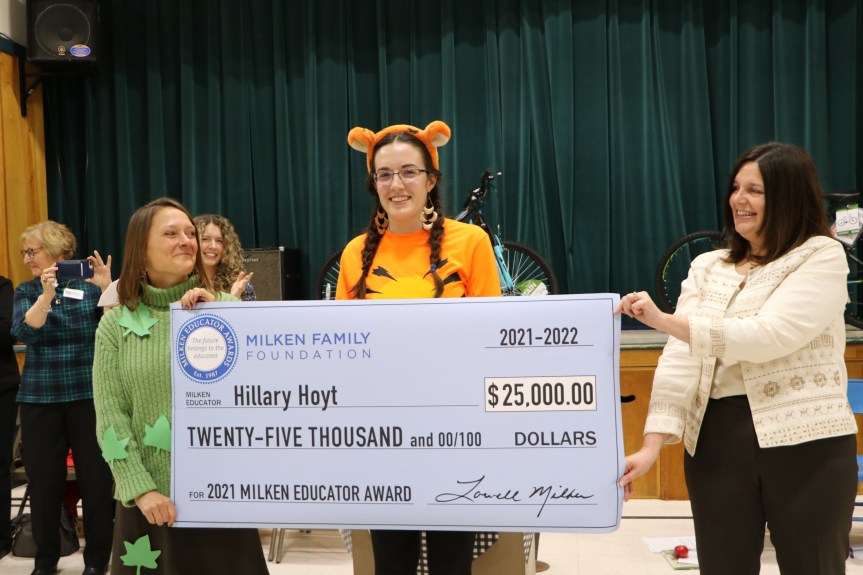 “Hillary Hoyt’s passion and dedication to her students, school, and community is truly awe inspiring,” said Maine Education Commissioner Pender Makin. “Her interdisciplinary teaching approach engages and excites her students and fosters a love of learning. Hillary is a trusted mentor and a leader in sharing her innovation and creativity with other educators. She also finds ways to support students and families beyond her classroom, whether as a dance instructor or providing free books to children over the summer. The Maine Department of Education is so proud to join the Milken Family Foundation and the entire RSU 22 community in honoring Hillary with this well-deserved recognition.”