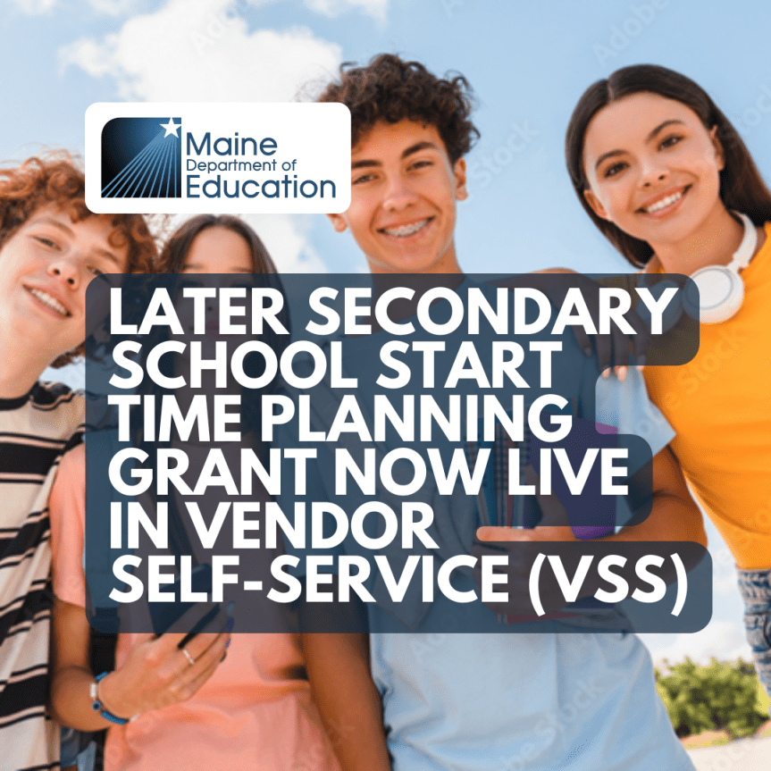 Pursuant to S.P. 182, L.D. 396, Resolve 2025, Chapter 110, the Maine Department of Education (DOE) is now accepting applications for a competitive, one-time funding opportunity for Maine school administrative units (SAUs) that are interested in collaborating to change school start times so that secondary schools begin at 8:30 a.m. or later.