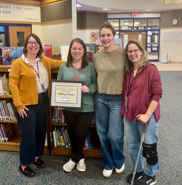 From left to right: Wentworth School Educational Technician Megan Blakemore, 2026 MASL Support Staff Educator of the Year Hillory Durgin, Wentworth School Library Educational Technician Kerry Boyd, and Wentworth School Library Educational Technician Lisa Farago